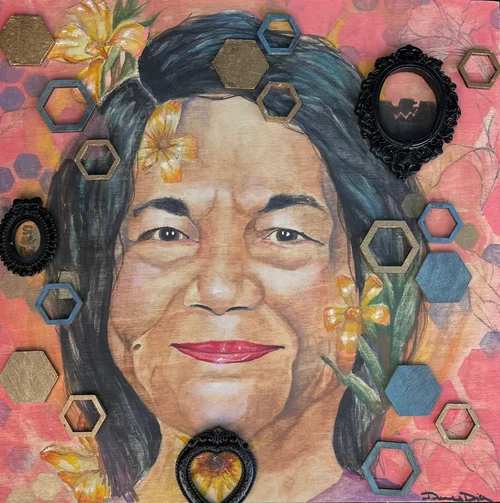 Nature weaves through these works, both as a metaphor for power and a reflection of the forces that shape women’s roles in society. The honeycomb—an emblem of structure, collaboration, and unstoppable force—sprawls across the compositions, growing and expanding like a movement too strong to be contained. Its interlocking cells symbolize the collective strength of women, the resilience built through shared struggles, and the ability to create and sustain life, both literally and metaphorically.